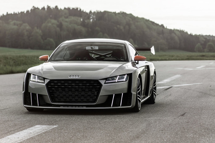 The manually adjustable rear wing is an advanced development of the Audi Sport TT Cup with which the brand very recently launched a dedicated race series. It is now 20 cm (7.9 in) wider, and the side flaps, which feature the four rings, were given a new geometry. The wing consists of carbon-fiber reinforced polymer (CFRF) as do all other add-on parts: the air inlets and the large splitter at the front, the side panels and side sill trims as well as the voluminous diffuser at the rear whose lateral segments reference the motif of the air inlets.